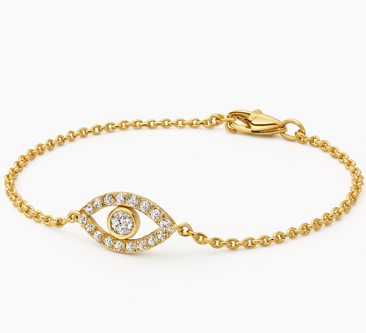 צמיד עין מעוצב מזהב 14K, משובץ יהלומים נוצצים ליצירת ברק וזוהר עדין ומרשים.