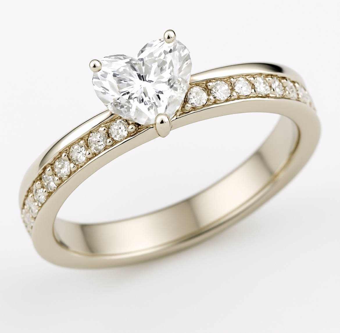 טבעת אירוסין רומנטית ויוקרתית, עשויה זהב 14K, משובצת יהלום בצורת לב מוקפד בעיצוב נקי ואלגנטי.