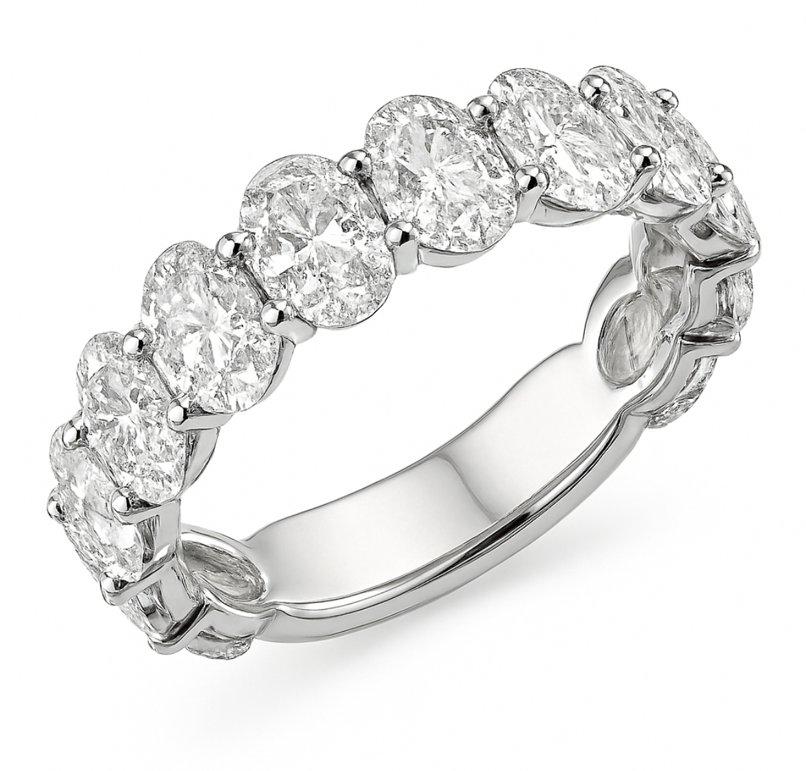 טבעת גלגל אובל יוקרתית מזהב 14 קראט עם 10 יהלומי מעבדה אובלים נוצצים. עיצוב אלגנטי וסימטרי המדגיש ברק ונוכחות, מושלם כטבעת הצהרה או כתוספת יוקרתית לכל תכשיט.