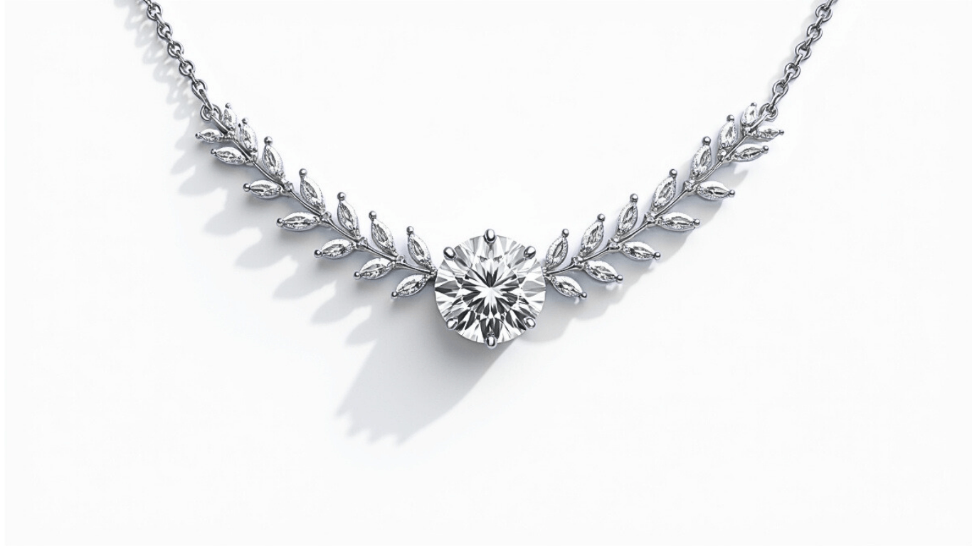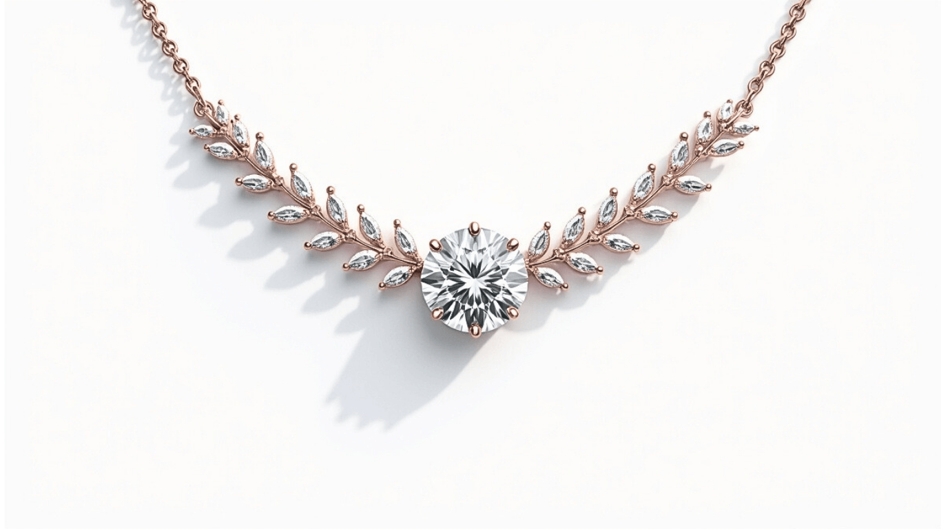 שרשרת זהב מעוצבת 14K עם יהלום מרכזי עגול נוצץ, משובצת ביד אומן בשיבוצים עדינים בצורת עלים. עיצוב קלאסי ואלגנטי שמעניק מראה יוקרתי וזוהר – מושלם כמתנה לאישה או כתוספת מושלמת למראה ערב. תכשיט יהלום שכולו נוכחות, סטייל ונשיות.