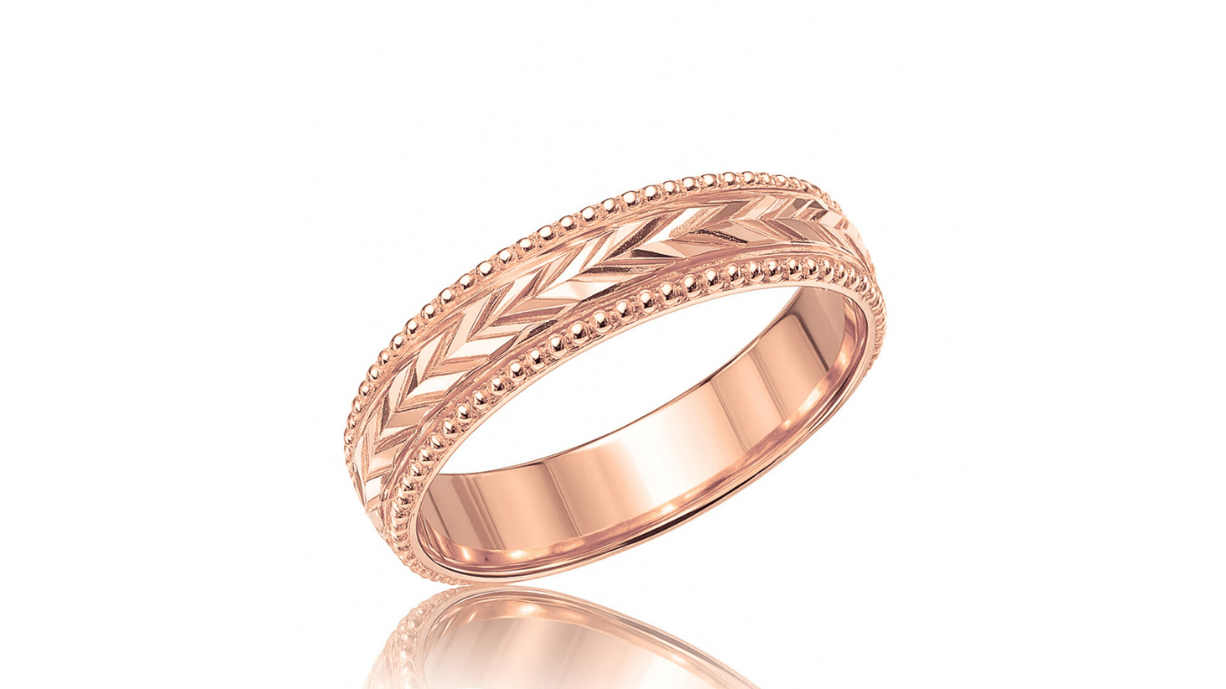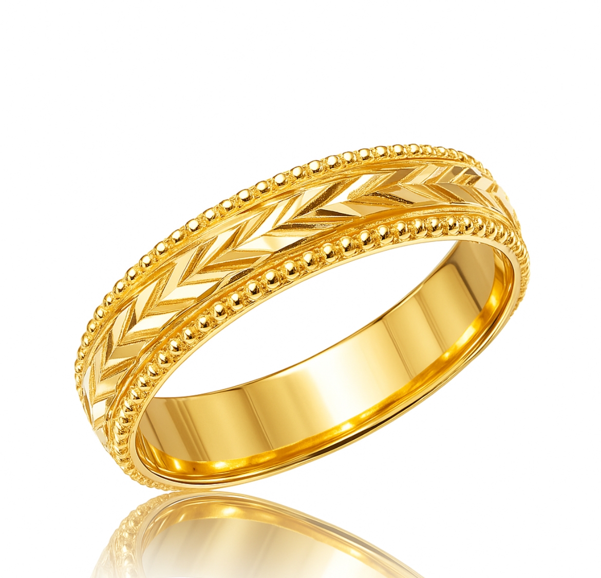 טבעת זהב 14 קראט בעיצוב קלאסי עם חריטת חצים מדויקת ושוליים מעוטרים בכדוריות עדינות – שילוב מושלם של יוקרה ותחכום.