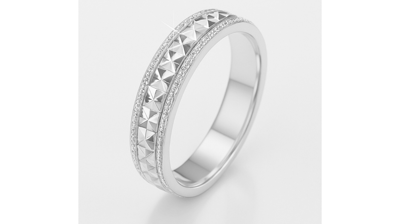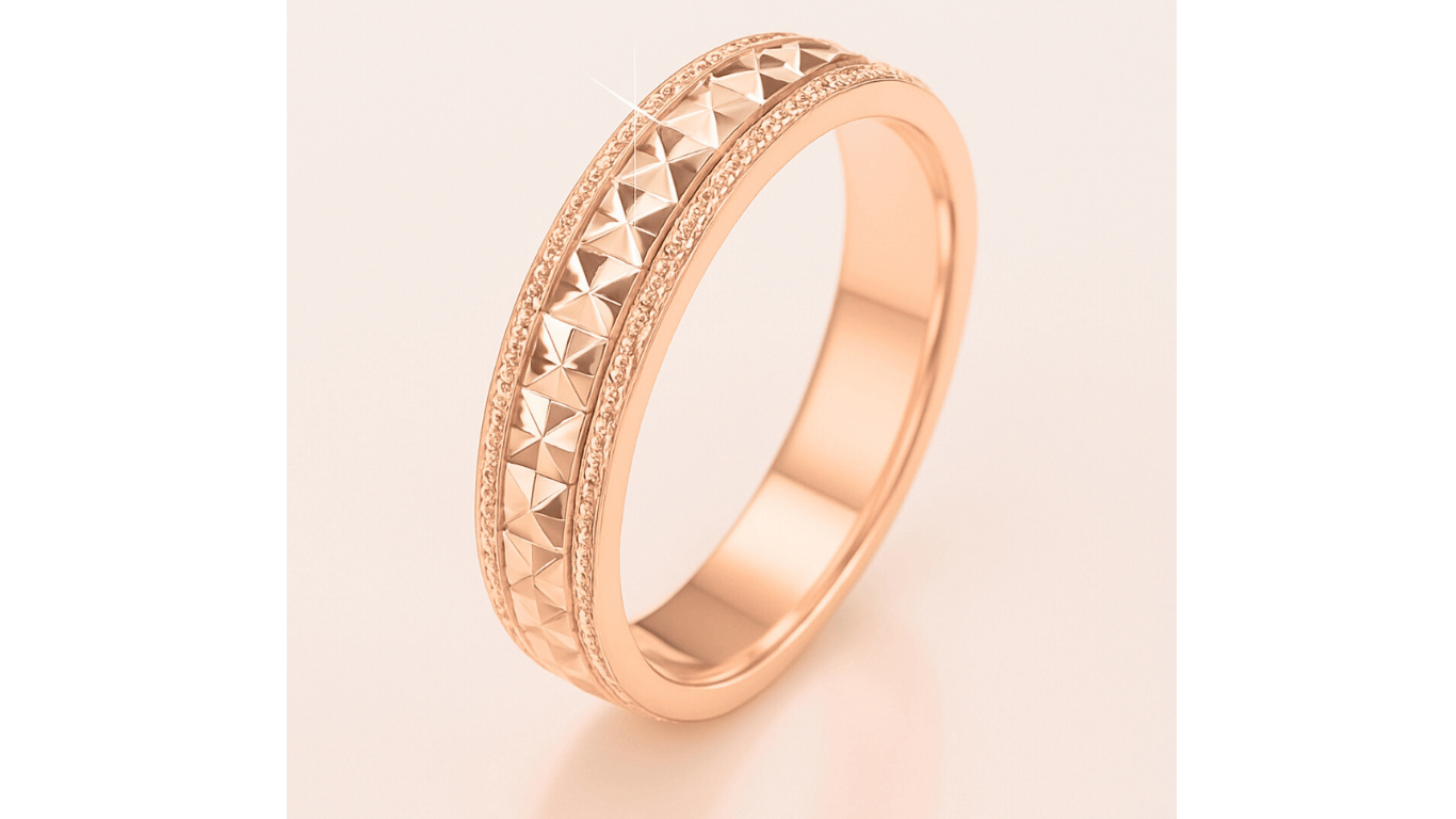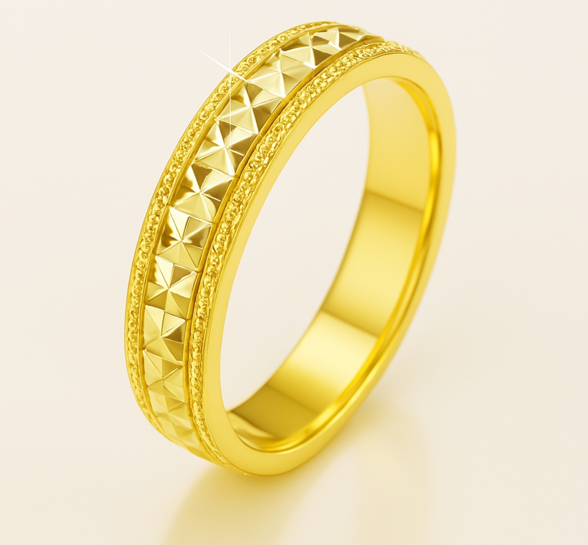 טבעת זהב 18 קראט עם עיטורי פירמידות ומסגרת דקורטיבית, טבעת נישואין קלאסית ויוקרתית לנשים המחפשות עיצוב מיוחד ואלגנטי.