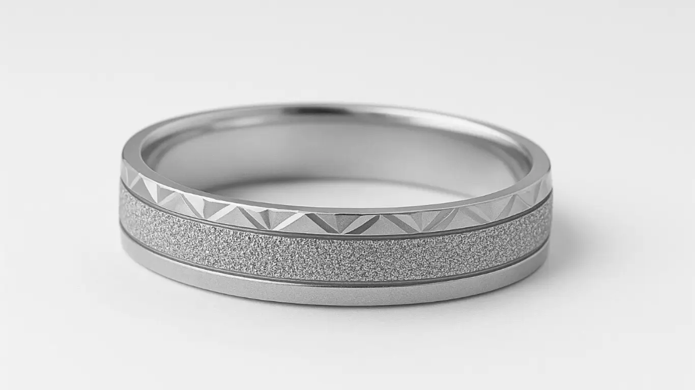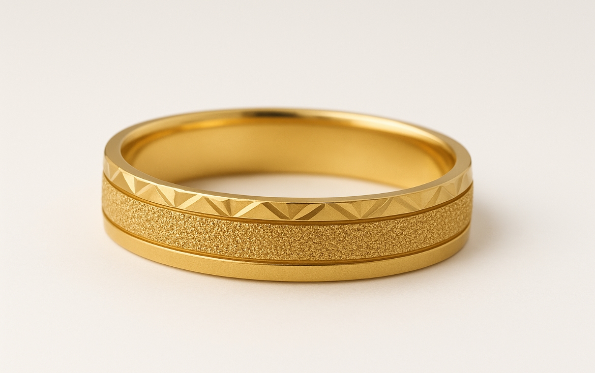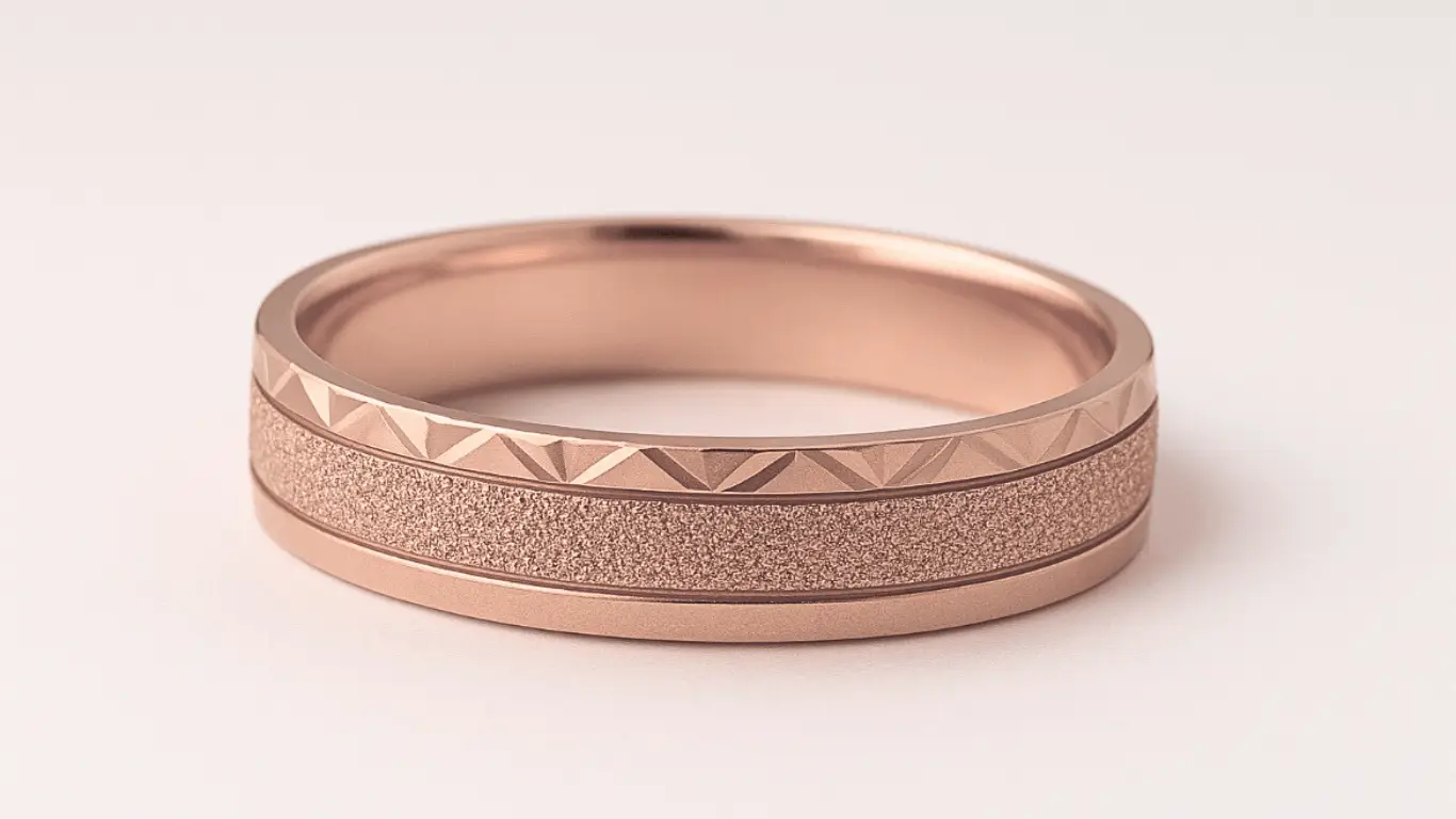 טבעת זהב 14 קראט רחבה עם עיצוב מיוחד הכולל שילוב טקסטורה מחוספסת ודוגמת משושים אלגנטית, טבעת נישואין או מתנה עם סגנון ייחודי וזוהר.