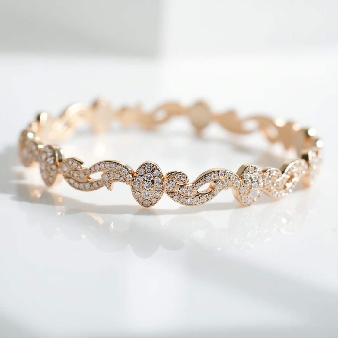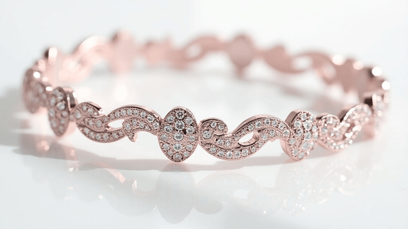 צמיד זהב רוז 18 קראט בעבודת יד עם שיבוץ יהלומים מבריק, בעיצוב מעוגל ואלגנטי. מעניק נוכחות נשית וזוהרת שמתאימה לכל הופעה יומיומית או לאירוע מיוחד. השילוב בין עידון ויוקרה הופך אותו לתכשיט חובה לכל אישה עם טעם מדויק.