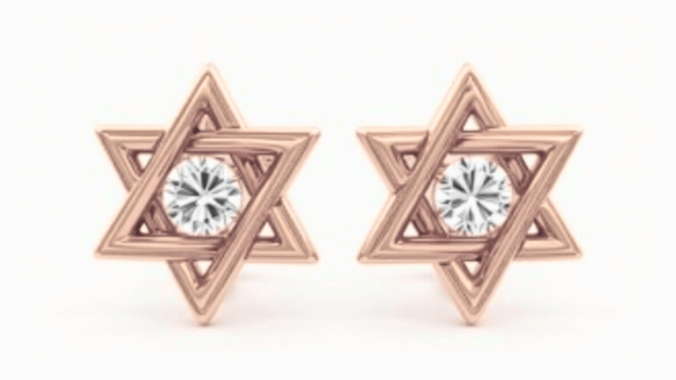 עגילי זהב 14 קראט בעיצוב מגן דוד מודרני וייחודי עם יהלום מרכזי. עגילים עדינים ונשיים שמתאימים לכל אירוע ומוסיפים נגיעה של יוקרה ואלגנטיות למראה.