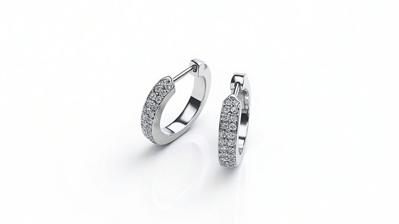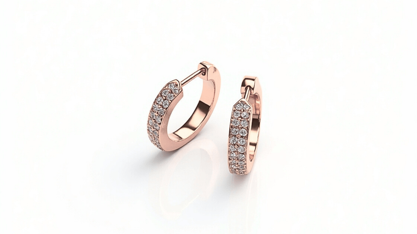 עגילי חישוק מזהב צהוב בעיצוב מעודן, עם חזית משובצת שתי שורות של יהלומים קטנים ונוצצים. עגילים שמשלבים נוחות יומיומית עם מראה יוקרתי שמתאים גם לאירוע מיוחד.
